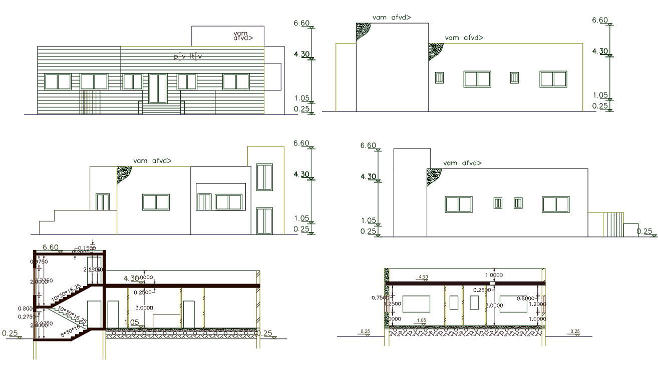 60 feet width and 45 feet depth of architecture house building sectional elevation design that shows single storey floor level detail. download 2700 sq ft plot size for house building design DWG file.