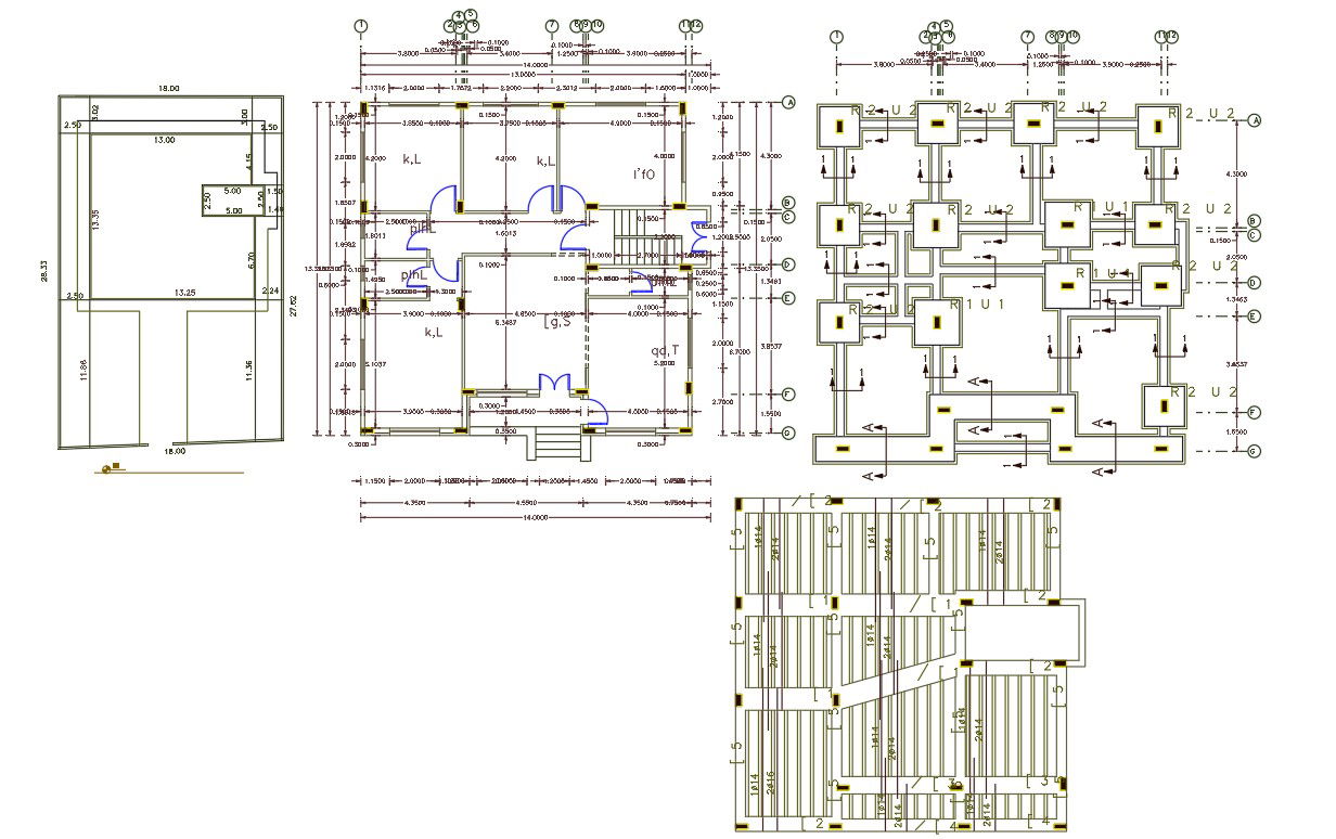 2d CAD drawing of architecture house floor plan design includes 3 bedrooms, kitchen, drawing and living area with a dimension detail. also has a foundation plan and slab bar structure design DWG file.