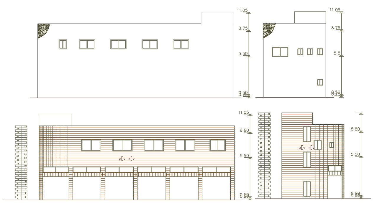 25-meter width and 8-meter depth of commercial shop building all side elevation design that shows 2 storey floor level with dimension detail. download 200 sq mt commercial shop building design DWG file.