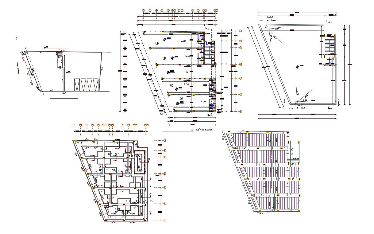2d CAD drawing of commercial shop project ground floor plan has 5 shops with attached toilet. also get more detail of construction working of foundation plan and reinforcement detailing of a slab bar done based on its support conditions. download commercial shop ground floor plan with parking space detail DWG file.