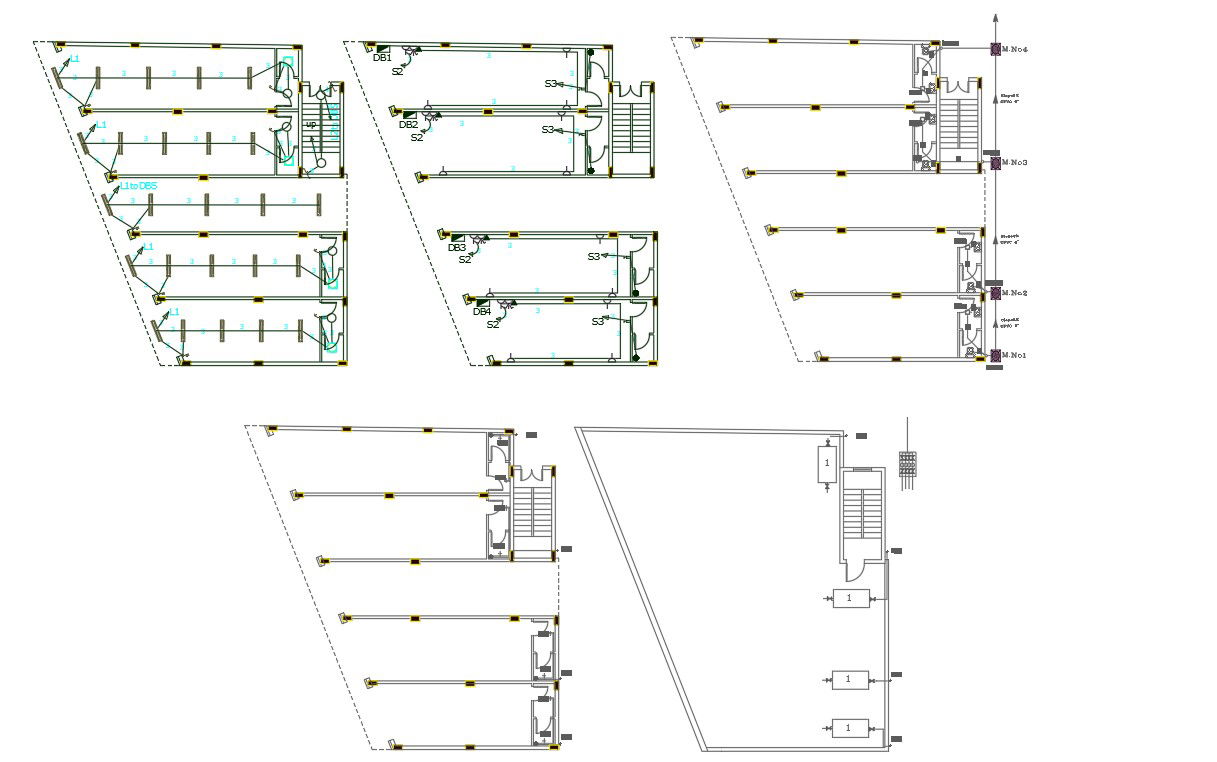 The ground floor plan has 5 shops with attached toilet plan design with electrical layout plan that shows ceiling false light and wiring with switchboard installation point detail DWG file.