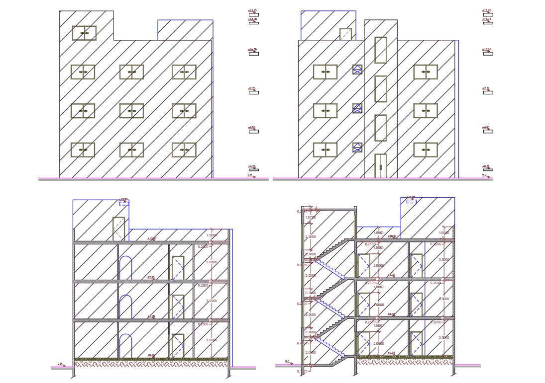 this is 4 BHK apartment house building section and elevation design includes door and window marking with dimension detail. also has a standard staircase and RCC slab design DWG file.