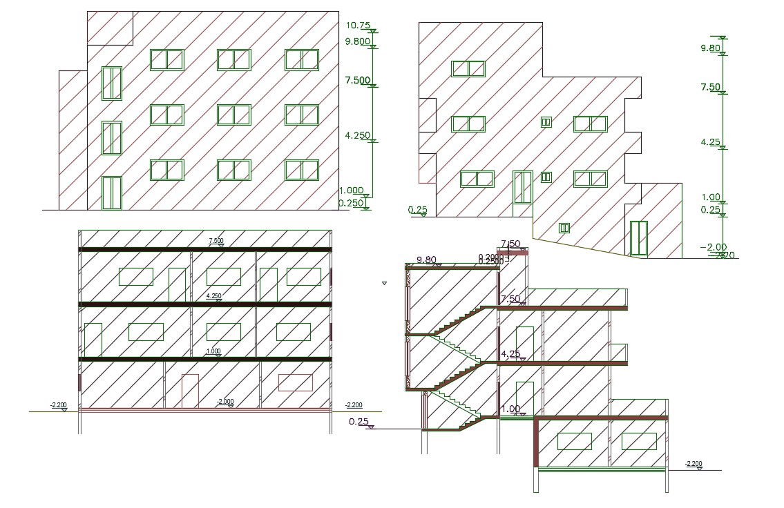 this is 3 BHK apartment building front and side view sectional elevation design that shows 3 storey floor with dimension detail. also has RCC sab and staircase design. download apartment building design DWG file in 2019 AutoCAD software.