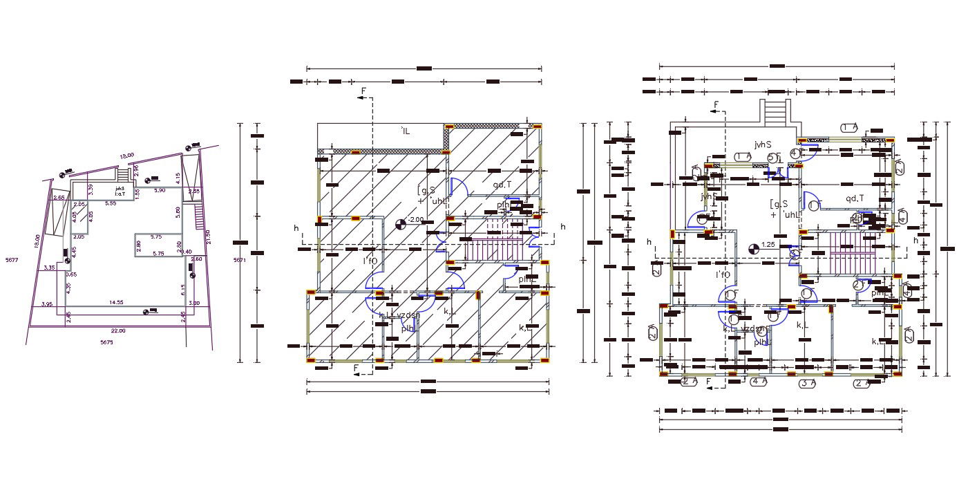 2d CAD drawing of architecture bungalow floor plan design that shows floor level detail with 3 bedrooms, kitchen, drawing, and all dimension detail. the ground floor has 1 car parking space with compound wall design DWG file.