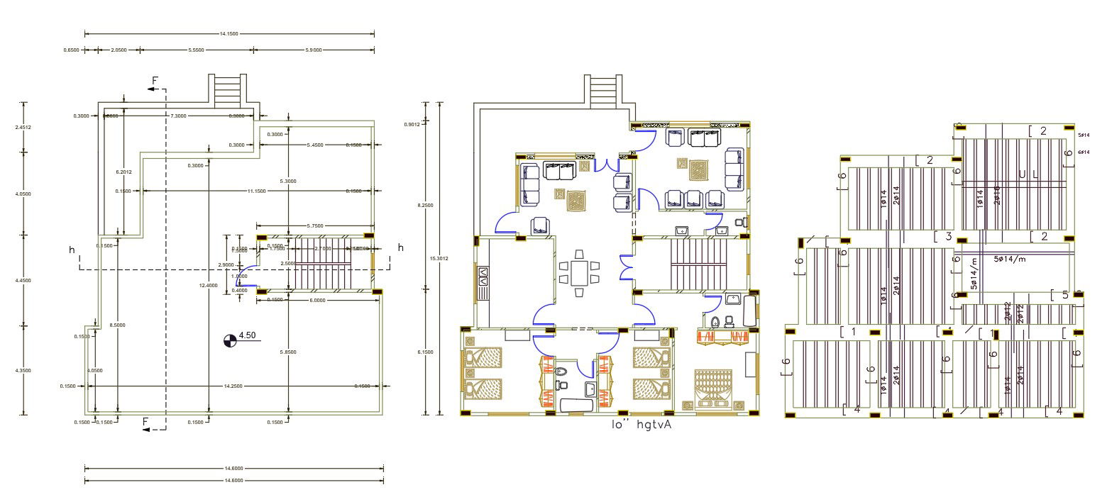 The architecture House furniture plan design CAD drawing that shows 3 bedrooms, kitchen, drawing room and living area. also has a slab bar column structure design with all dimension detail. download 50 by 45 feet house plan design DWG file.