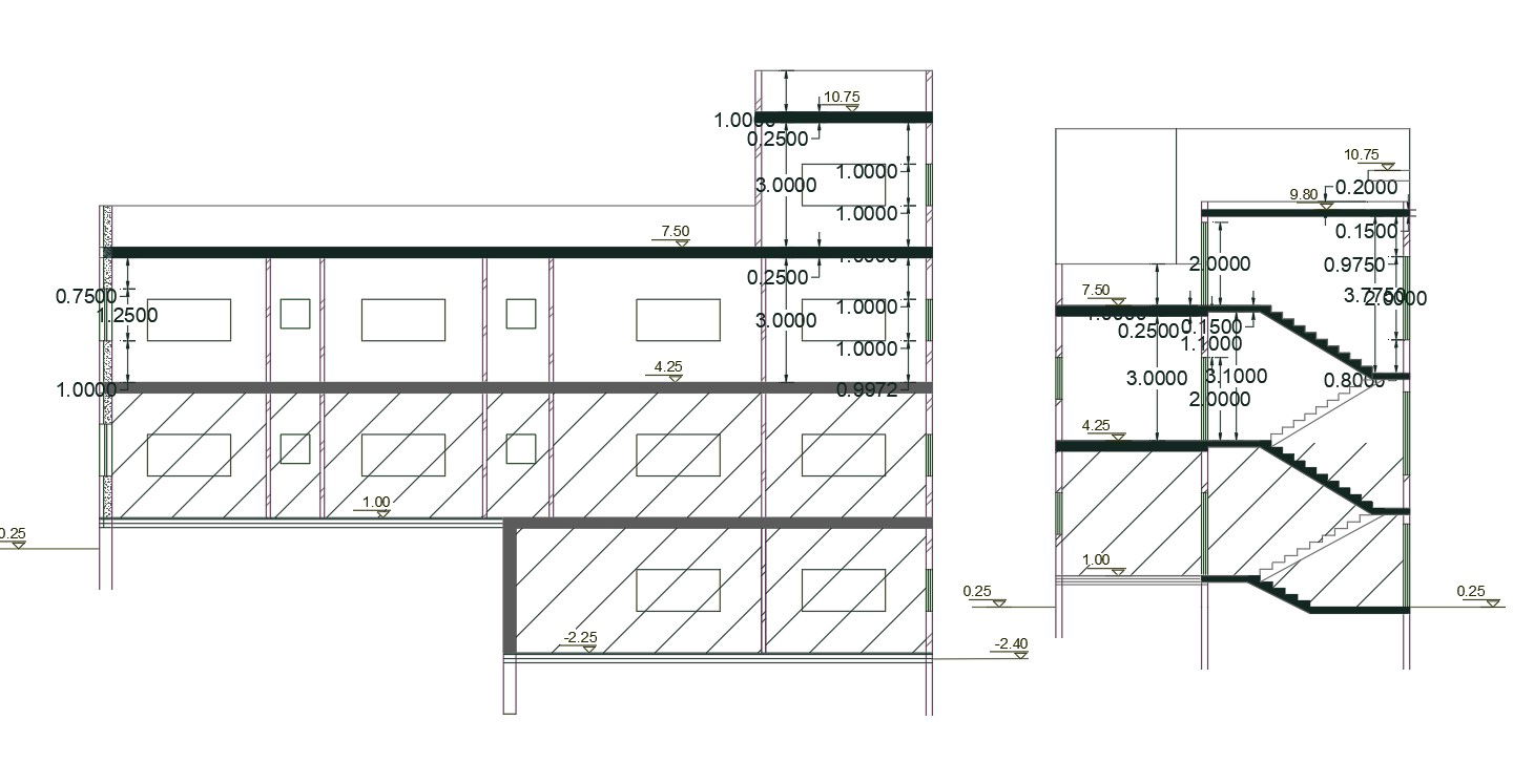 2d CAD drawing of architecture house building front and side view section drawing that shows 2 storey floor level and RCC staircase detail. download free DWG of house section and learn how to draw section drawing in AutoCAD 2019 software.