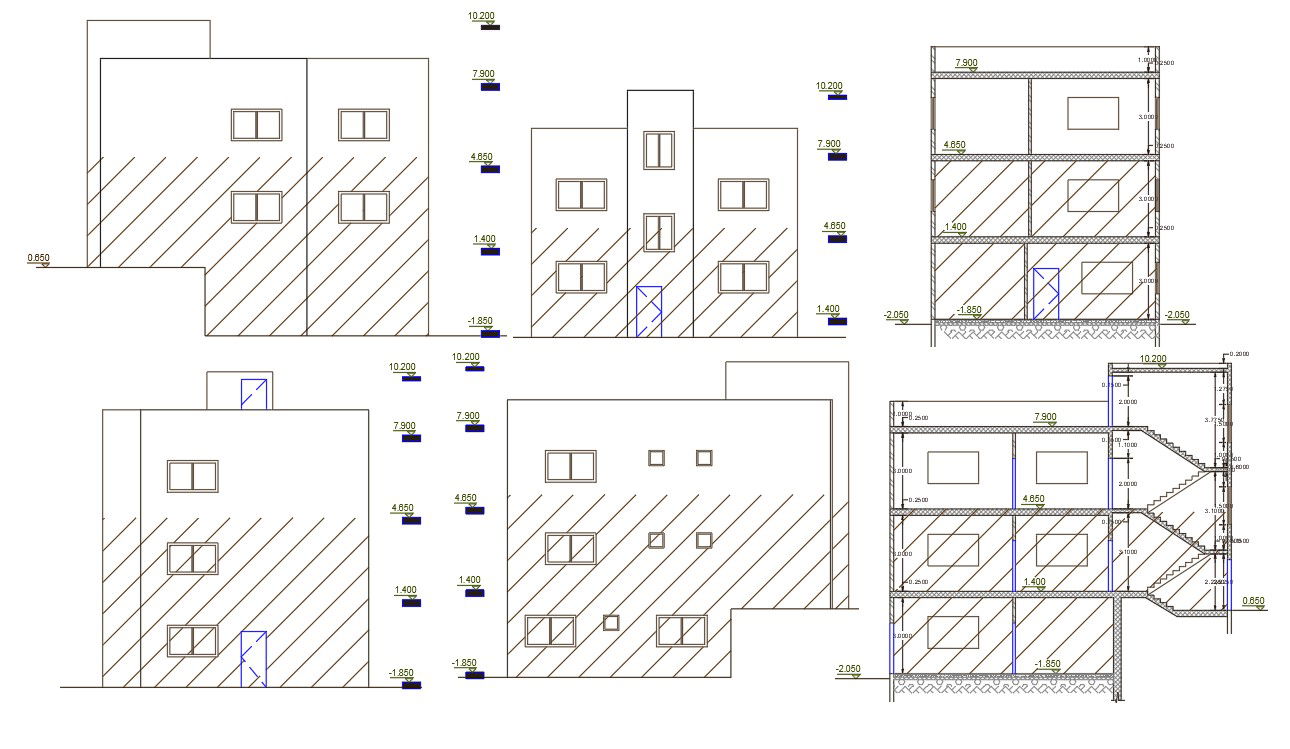 3 Storey apartment building sectional elevation design which is from a number of view in a different angle design also has some AutoCAD hatching design with dimension detail and RCC staircase design. download apartment house building design DWG file.