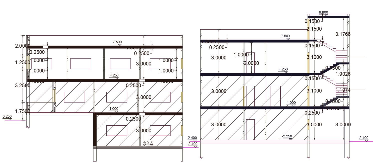 AutoCAD drawing of apartment building section drawing the contains of 3 storey floor level structure design, RCC slab, wall section and some AutoCAD hatching design to improving the CAD presentation. download 32 by 50 feet apartment building section drawing DWG file.