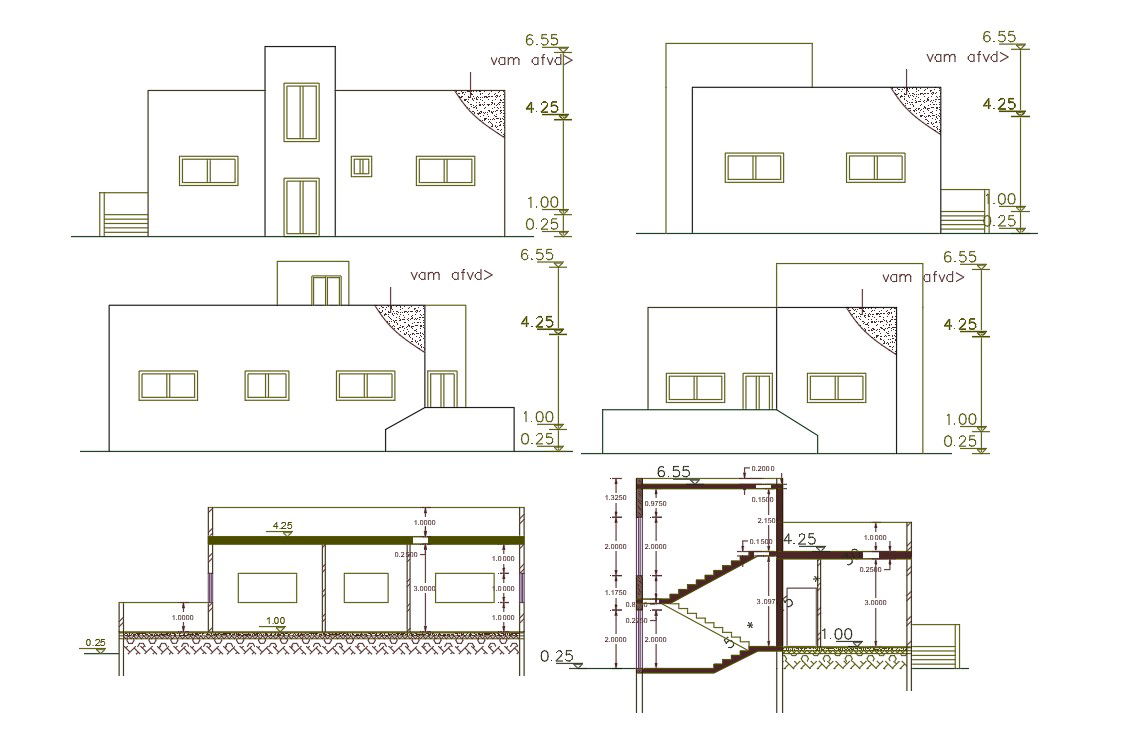 40 feet width and 30 feet depth of 2 BHK single storey house building section drawing and elevation design with all dimension detail. download 1200 square feet (133 Square Feet) plot size house building design DWG file.
