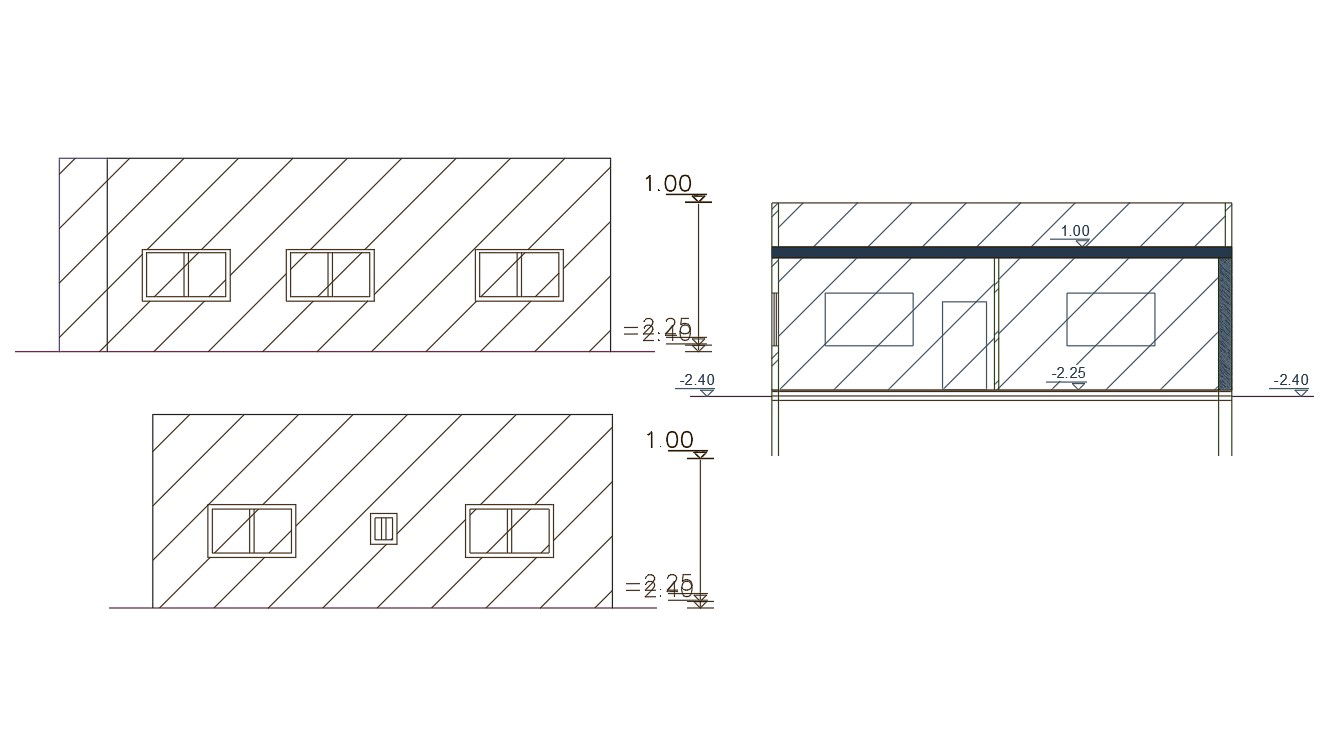 32 feet width and 40 feet depth of single storey house building sectional elevation design. download free 3 BHK house building design DWG file.