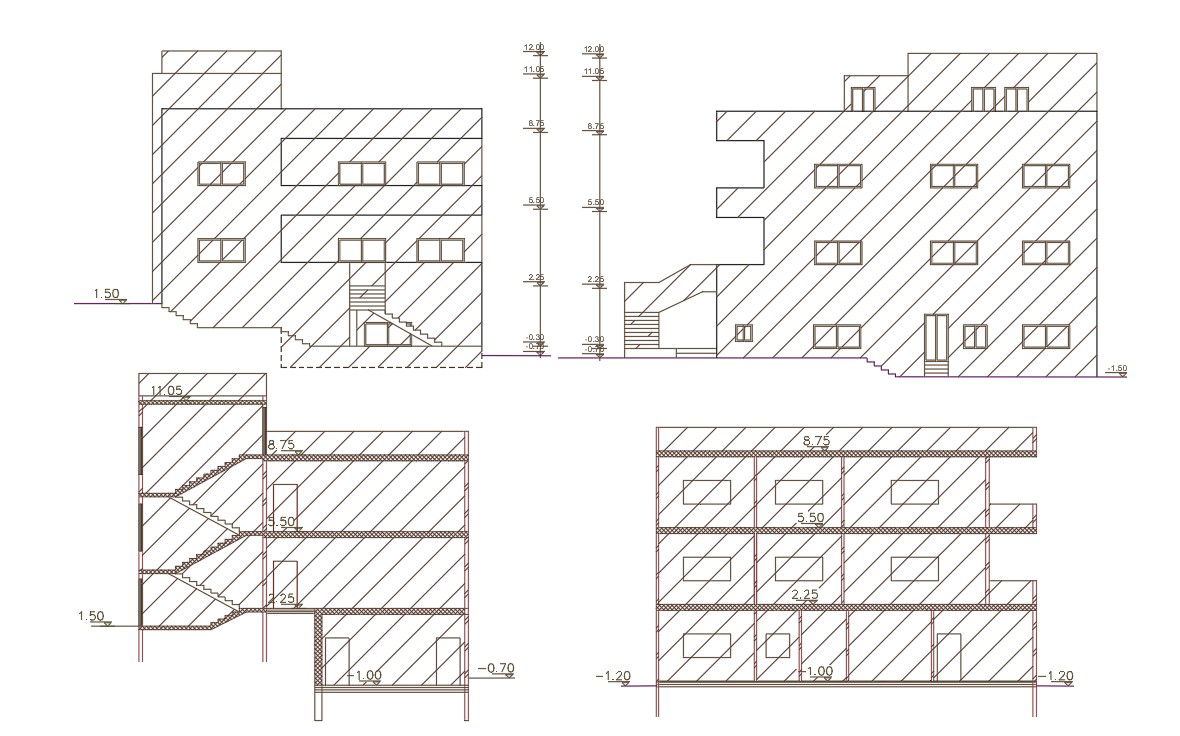 2d CAD drawing of 45 feet with and 52 feet depth of AutoCAD house building sectional elevation design that shows front and side view design. download 260 square yards house building design DWG file.