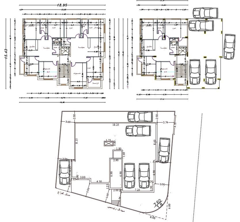 50 by 62 feet plot size for 3 bedroom house apartment plan with all dimension detail also has master plan CAD drawing includes building area with a parking lot and compound wall design. download 3100 Square feet 2 unit house apartment plan design DWG file.