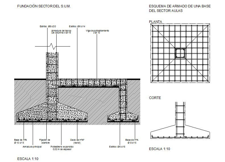 This Footing main reinforcement, fixing wire, expanded polystyrene, Bracing beam, outline of a base assemby, & plan & section detail.