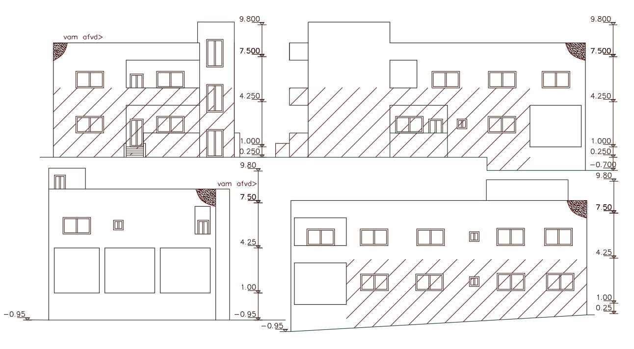 2d CAD drawing of 2 storey residence house building all side elevation design with dimension detail and has some AutoCAD hatching design to improve the CAD presentation. download 42 feet width and 68 feet depth of house building design DWG file.