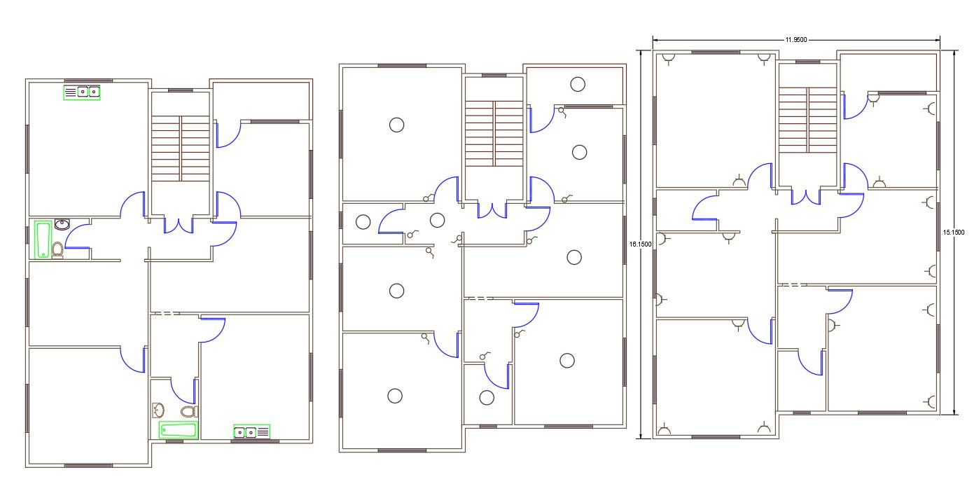 3 bedroom architecture house electrical layout plan design that shows ceiling light and switchboard marking detail for proper installation of the wiring plan.download 2080 square feet house plan design DWG file.