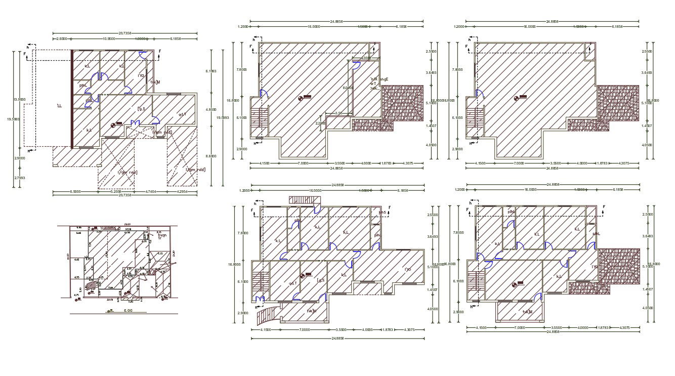 2d CAD drawing of architecture residence bungalow ground floor, first floor and second-floor plan design with dimension detail also has terrace top view terrace plan design with Dimension detail. download 62 by 65 feet porch bungalow floor plan DWG file.