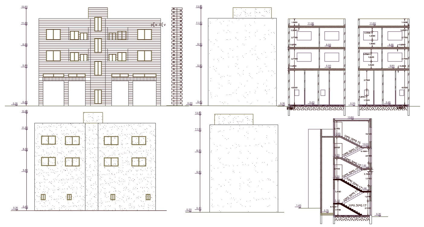55 feet width and 30 feet depth of architecture apartment building section drawing and elevation design that shows all side view and standard staircase design with dimension detail. download 183 Square yard house building design DWG file.