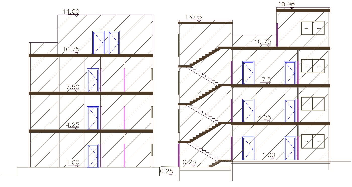 36 by 42 feet apartment building front and side view section drawing with dimension detail. 3 BHK apartment building section drawing DWG file.