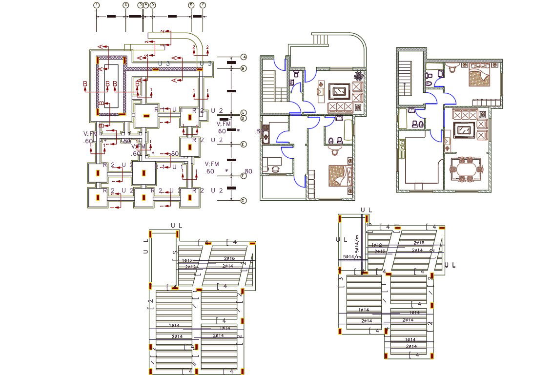 The architecture AutoCAD drawing of the ground floor plan and first-floor plan with furniture layout plan design. it has a construction working plan that shows centre line plan and foundation plan with slab bar structure design.