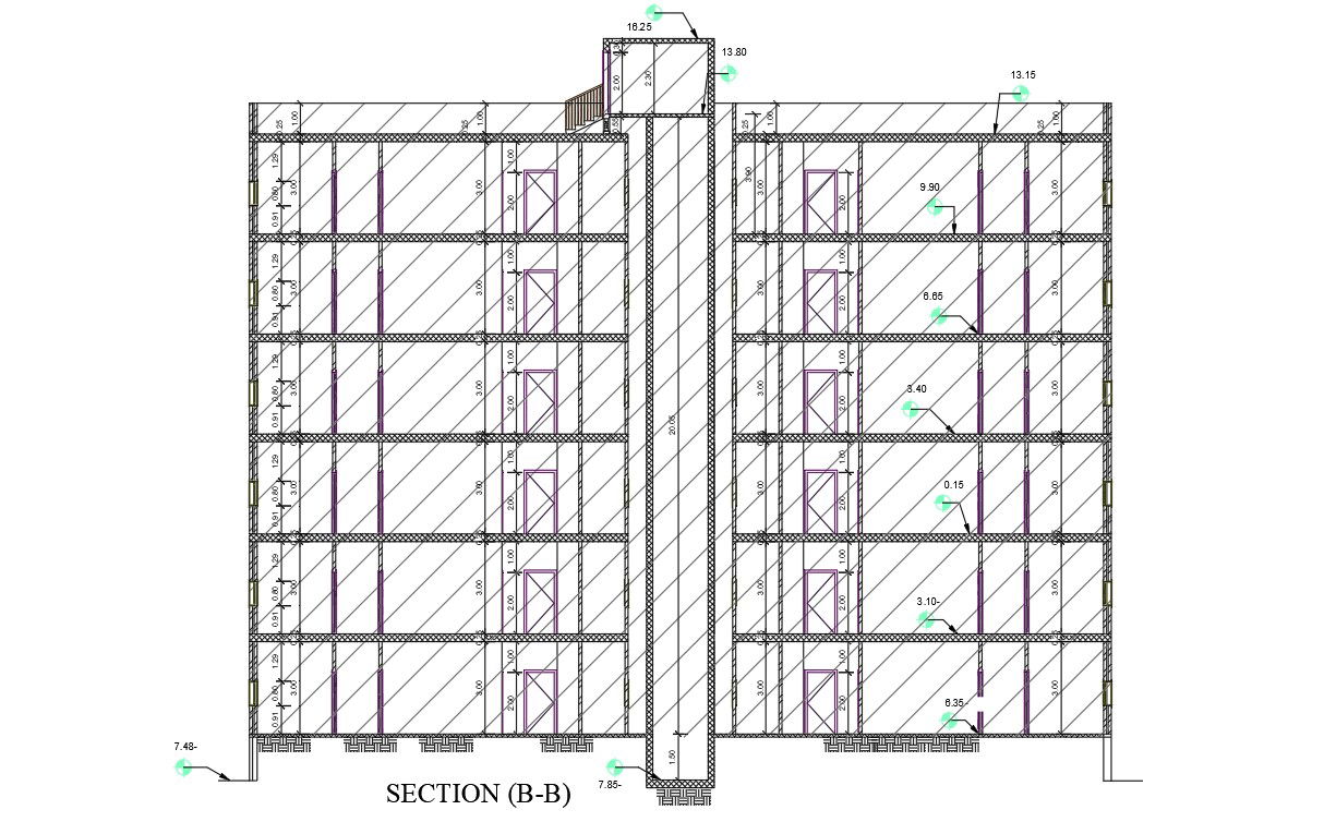 2d CAD drawing of 2 BHK apartment building section drawing that shows RCC slab and elevator space detail. download 6 storey apartment building section drawing DWG file.