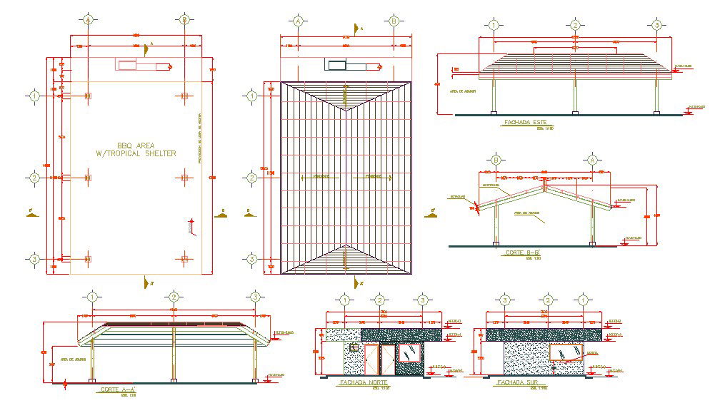 Structure roof detail DWG file. & plan design, elevation design & all side section detail.