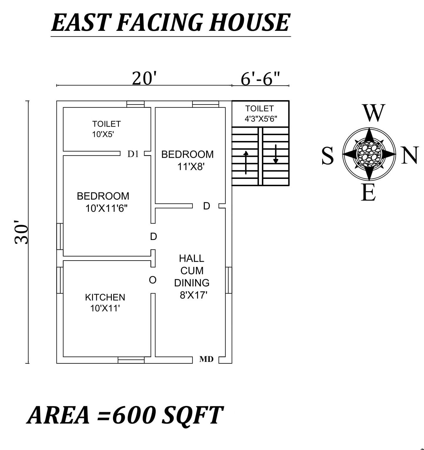 Autocad Drawing file shows 20'x30' Amazing 2bhk East facing House Plan As Per Vastu Shastra. The total buildup area of this house is 600 sqft. The kitchen is in the Southeast direction. Hall cum Dining is available in the Northeast direction. The master bedroom available in the south direction with the attached toilet is in the southwest direction. kid's bedroom is in the northwest direction. A staircase is available in the northwest Direction outside of the house. A common toilet is available under the staircase. Road Available in the east direction.Download Autocad Drawing file and PDF file.