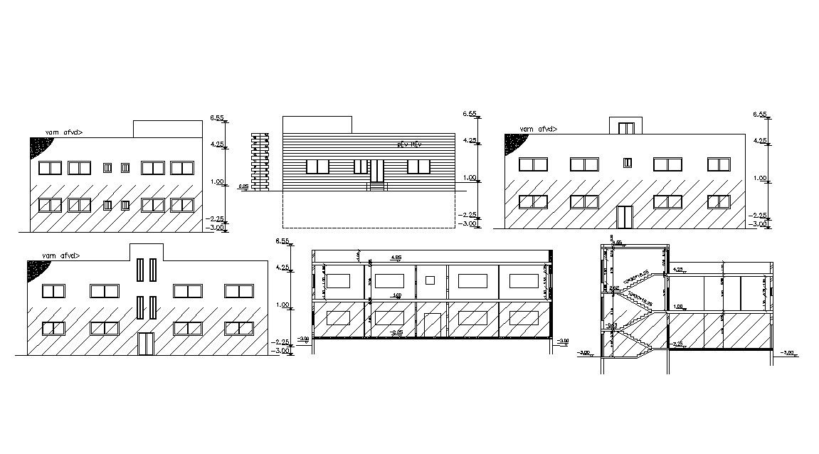 AutoCAD drawing of architecture house building all side elevation design and section drawing that shows all dimension detail. download 50 by 65 feet house house building design DWG file.