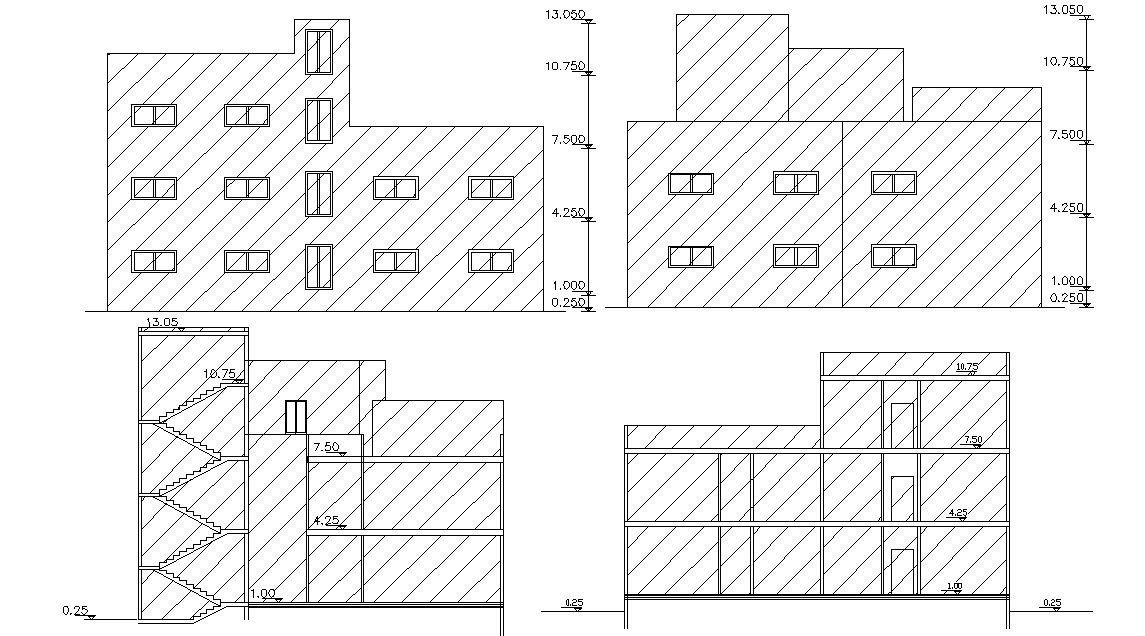 this is 3 BHK apartment building sectional elevation design that shows front and side view with some AutoCAD hatching design with with dimension detail. download 3 storey apartment building design DWG file.