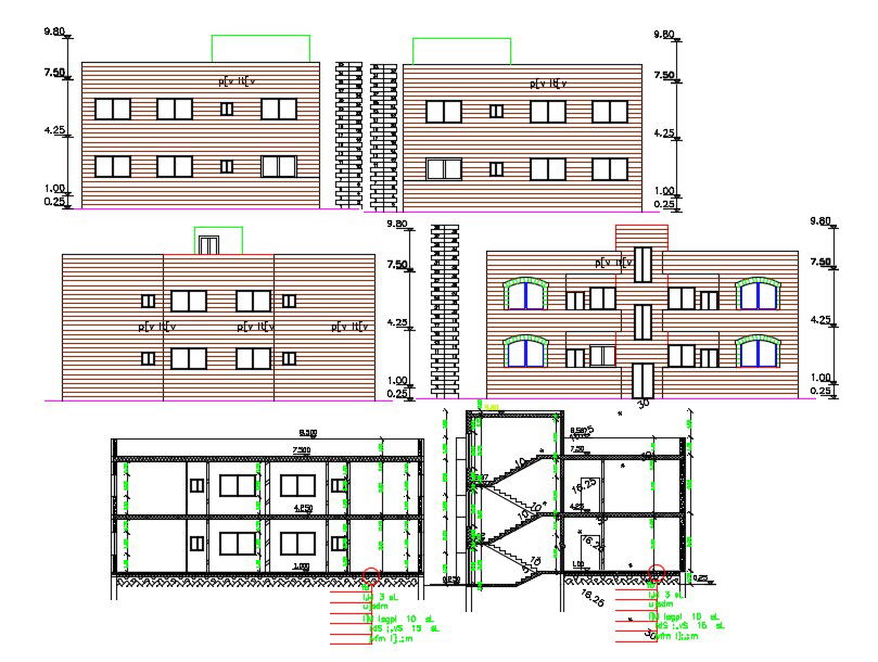 The architecture bungalow building sectional elevation design in all side view with dimension detail. 45 feet width and 40 feet depth of bungalow building design. download 200 square yard bungalow building design DWG file.