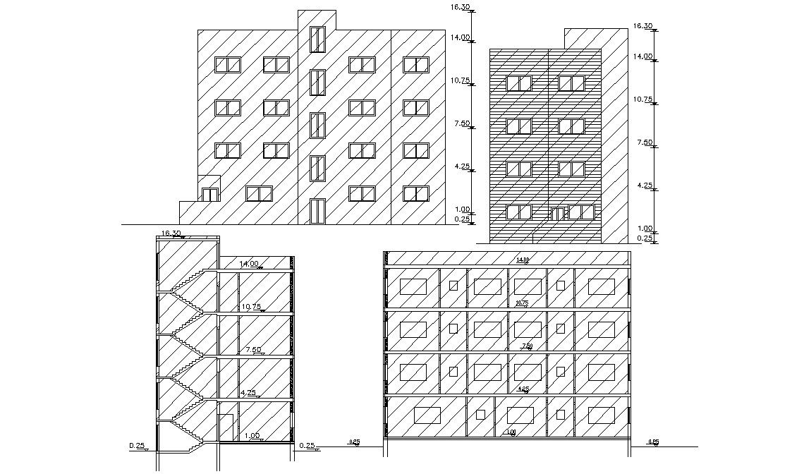 this is 3 BHK and 2 BHK apartment building sectional elevation design that shows 4 storey floor level building structure design, front and side view design with dimension detail. download 34 by 60 feet apartment building design DWG file.