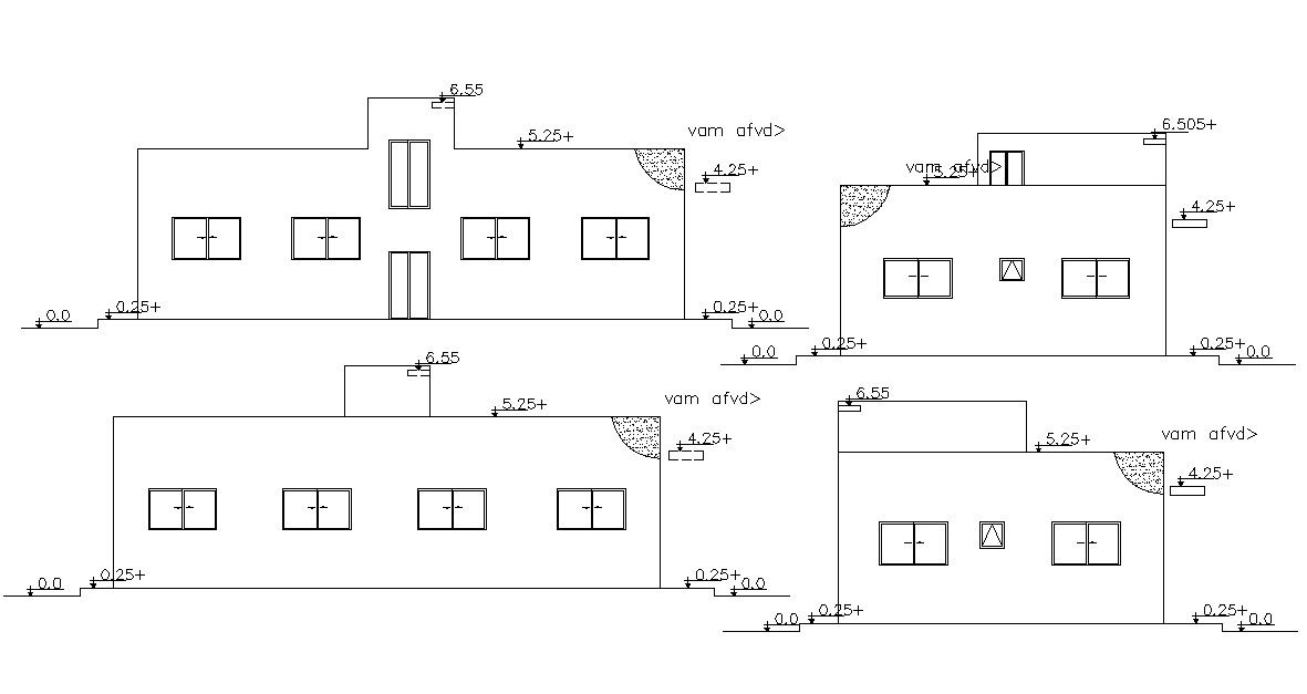 52 feet width and 32 feet depth of 2 BHK joint house building elevation design which are view from number of different angle. download house building design elevation design DWG file and use this drawing for your CAD presentation.