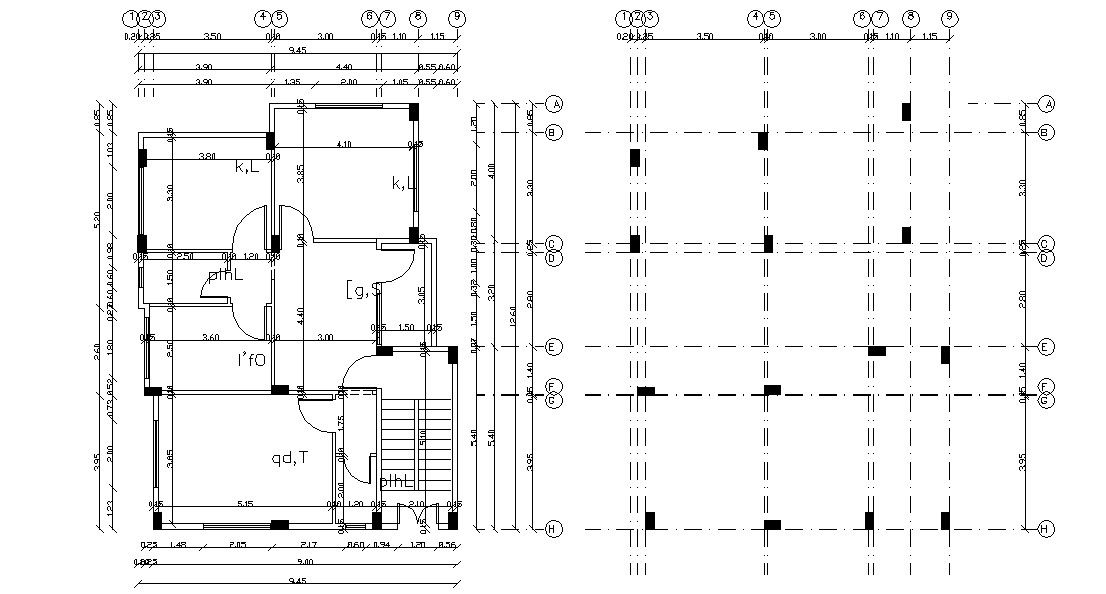 30 by 40 feet plot size for 2 BHK house plan design with column layout plan with center line plan design. download 1200 square feet house plan design with all dimension detail DWG file.
