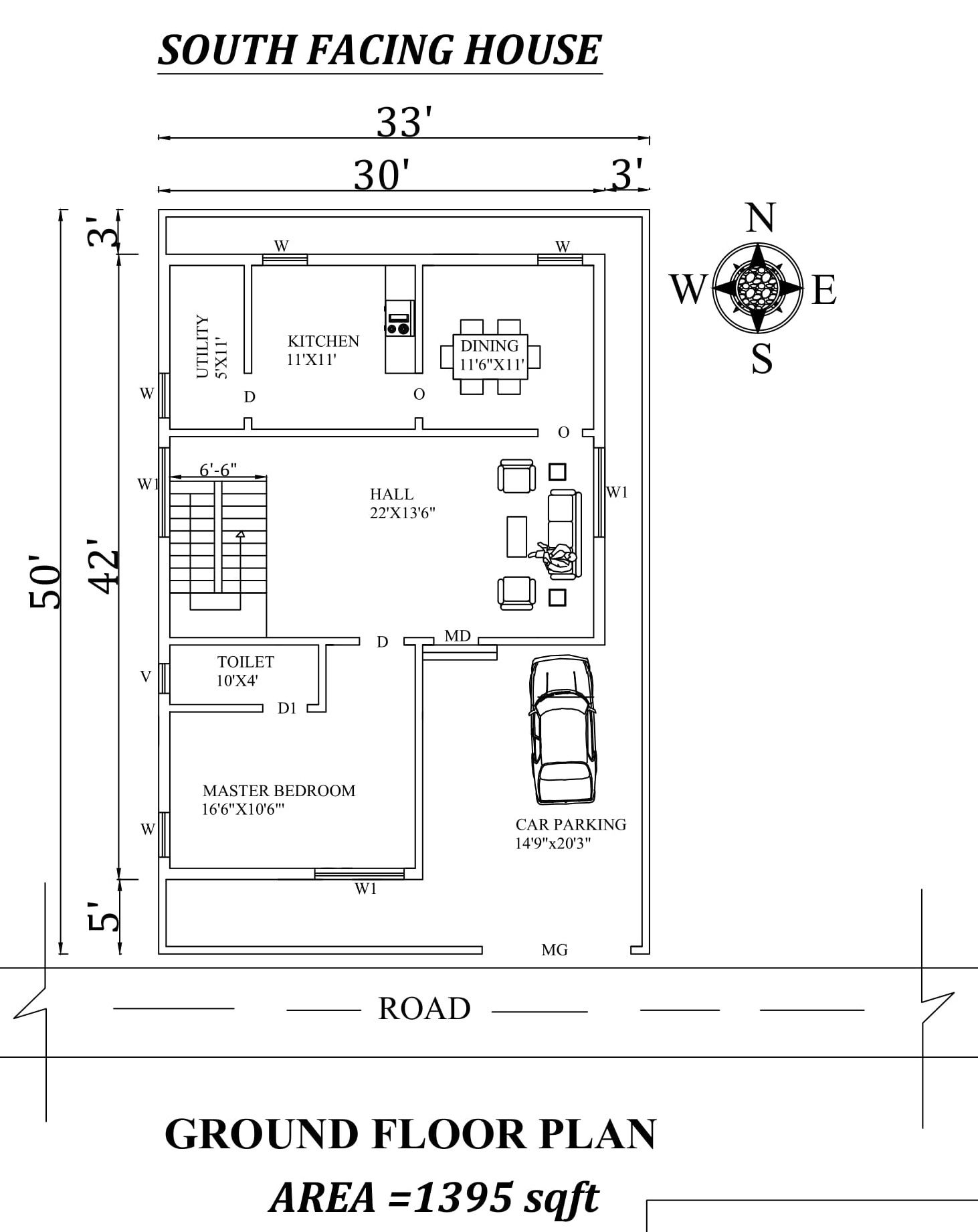 Autocad Drawing file shows 33'x50' South facing Ground Floor House Plan As Per Vastu Shastra. The total buildup area of this house is 1395 sqft. The kitchen is in the North direction. The Utility near the kitchen placed in the Northwest direction. The Dining is Placed in the Northeast direction. The master bedroom available in the southwest direction with the attached toilet is in the west direction. A staircase is available in the west inside of the house. The Hall is in the Southeast Direction.Portico/Car parking is available in the Southeast direction of the house. Road Available in the South direction.Download Autocad Drawing file and PDF file.