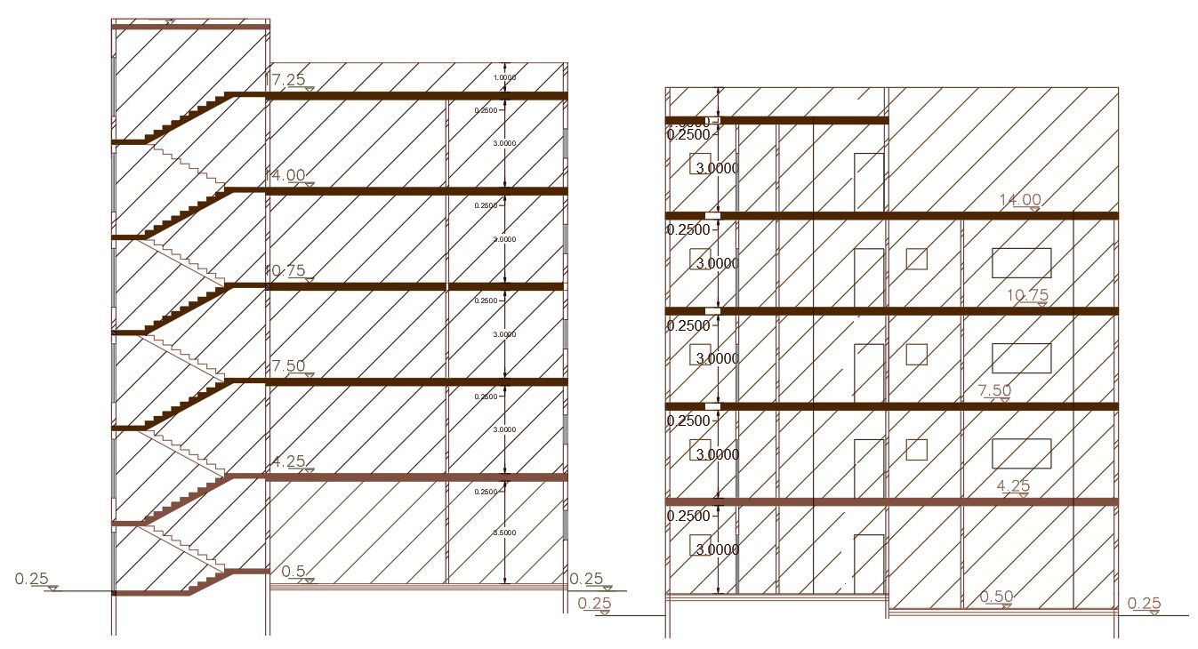 AutoCAD drawing of 50 X 50 feet apartment house building section drawing that shows standard staircase and RCC slab bar with dimension detail and has some AutoCAD hatching design. download 2500 sq ft house building CAD section drawing.