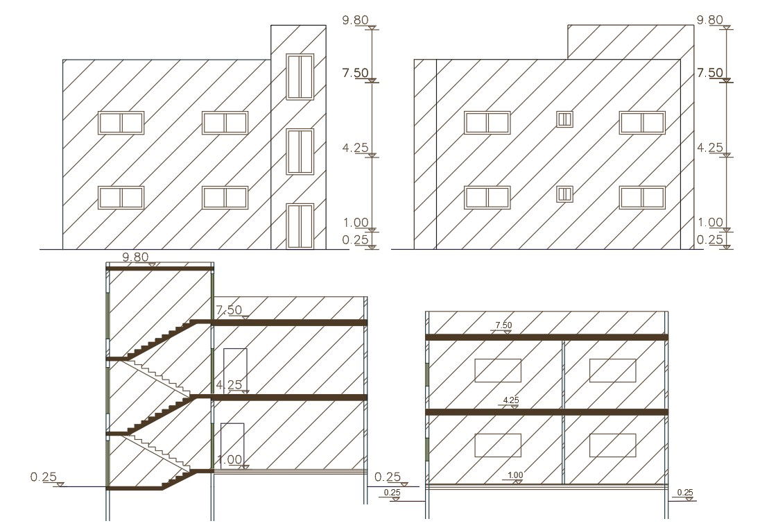 2d CAD drawing of 36 feet width and 36 feet depth of 2 BHK house building section elevation design which is view from front and side with dimension detail. download 2 storey house building design DWG file.