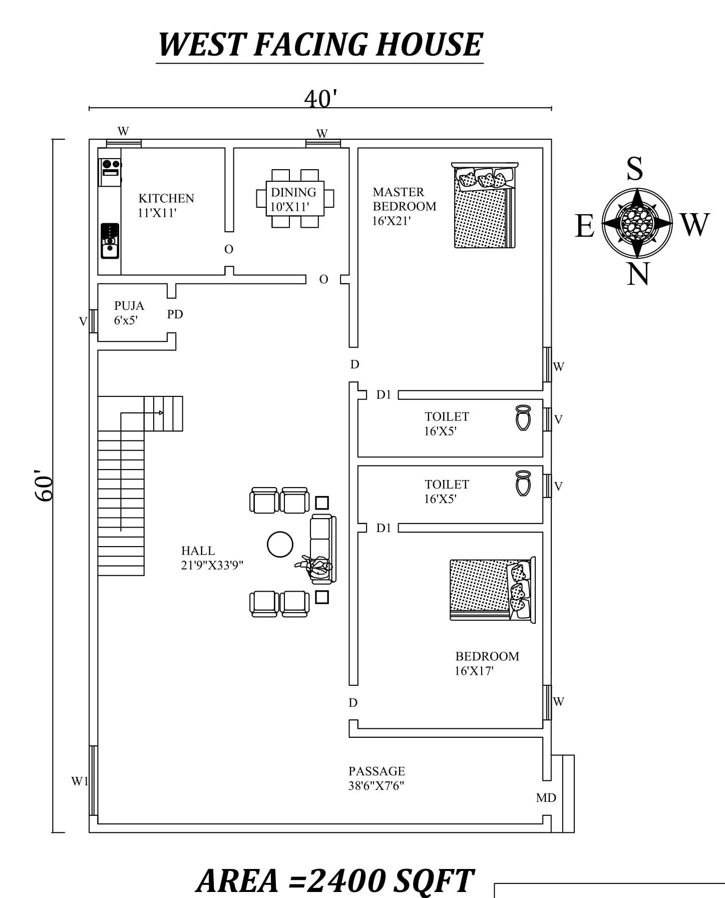 40'x60' 2 BHK West Facing House Plan As Per Vastu Shastra, Autocad DWG file Details