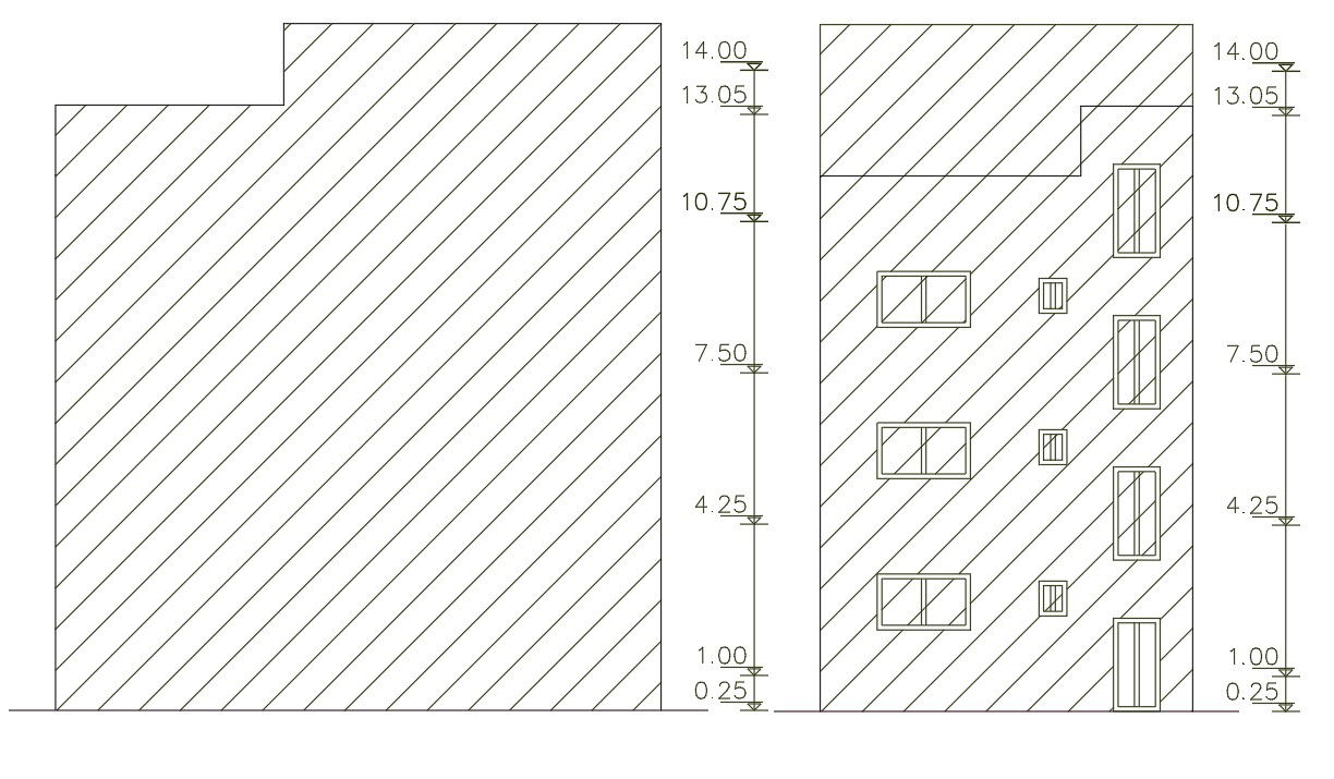 The residence 2 BHK apartment building front elevation and side elevation design with dimension detail and has some AutoCAD hatching design for improving CAD presentation. download 3 storey apartment building design DWG file.