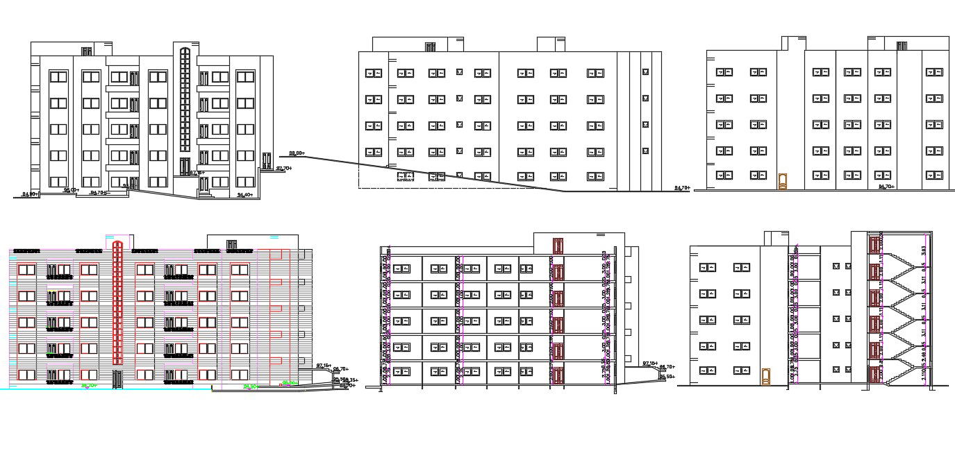 The architecture apartment building section drawing and elevation design that shows 5 storey building structure design, door, and window marking detail with dimension. this drawing can be helpfull for visualization of the apartment building which we are expecting after the construction.