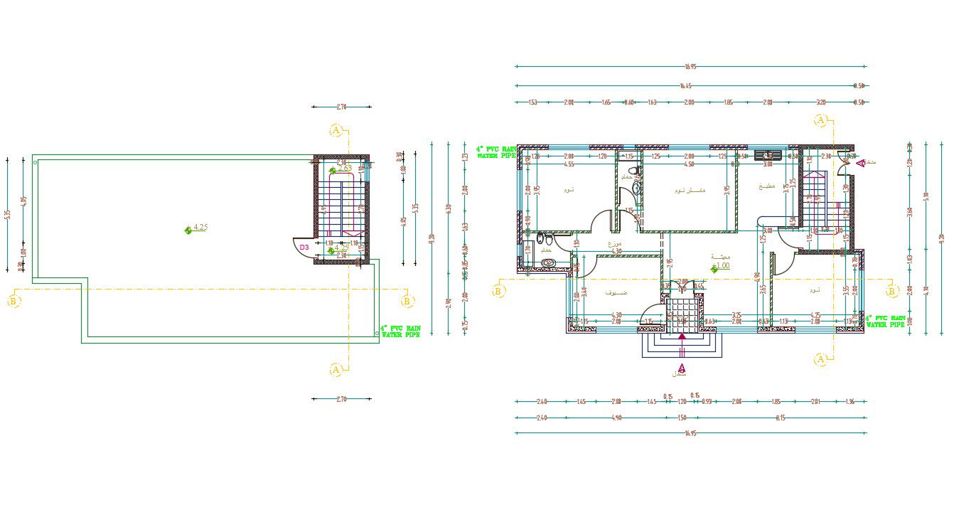 AutoCAD drawing of 3 bedrooms house ground floor plan and terrace plan design includes all dimension detail and wall thickness size with window space marking. Download 30 X 55 feet plot size for house plan AutoCAD file.