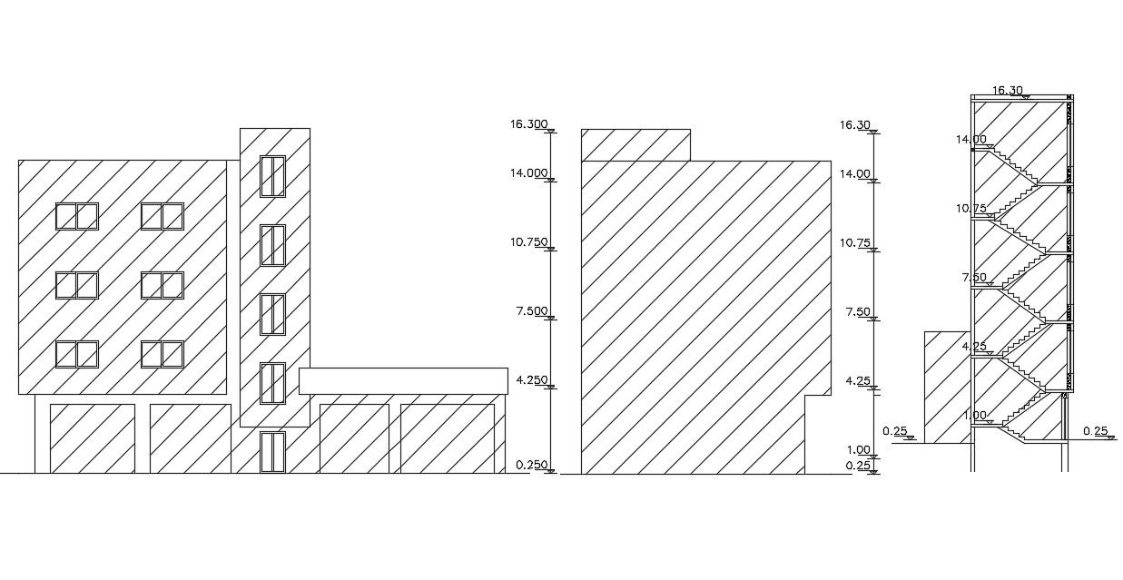 3 storey residential apartment building front and side view elevation design with dimension detail that shows retail shop on the ground floor and top floor 2 BHK house design. download apartment elevation design with standard staircase section drawing DWG file.