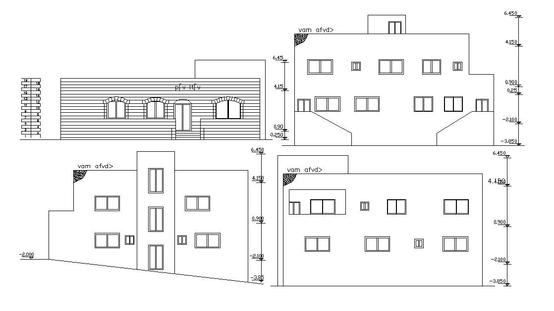 AutoCAD drawing of 52 by 52 feet architecture house building all side elevation design with dimension detail. download 300 Sq Yards House Building design AutoCAD file.