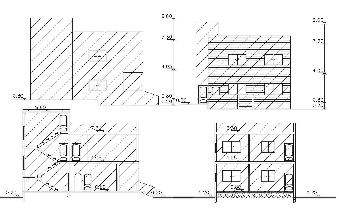 AutoCAD Drawing of residence house 40 feet width and 34 feet depth of 2 storey house building design. download 150 square yards house building sectional elevation design that shows front and side view AutoCAD file.