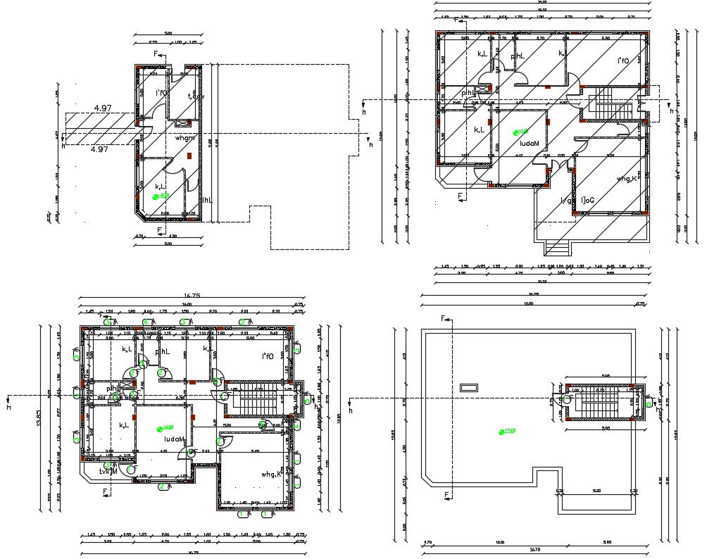 45 X 55 feet architecture house ground floor plan, first-floor plan and terrace plan design that shows door and window marking detail. download 275 squarer yards 3 BHK house plan design with column layout plan and all dimension detail DWG file.