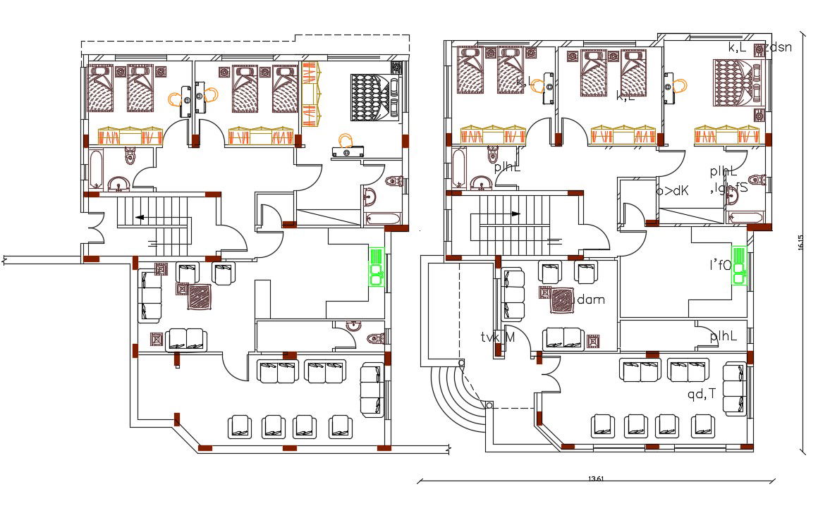 44 by 52 feet plot size for architecture house ground floor and first-floor plan with furniture layout plan design that shows 3 bedrooms, drawing room, living area, and modular kitchen design. download luxurious house plan design with column layout plan DWG file.