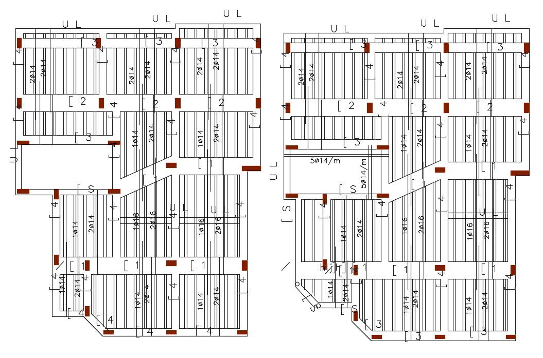 The residence house construction working plan CAD drawing includes RCC (Reinforced Cement Concrete) column supported slab bar structure design that shows parallel to the shorter and longer direction bar bending. download free DWG file of slab bar reinforcement design.