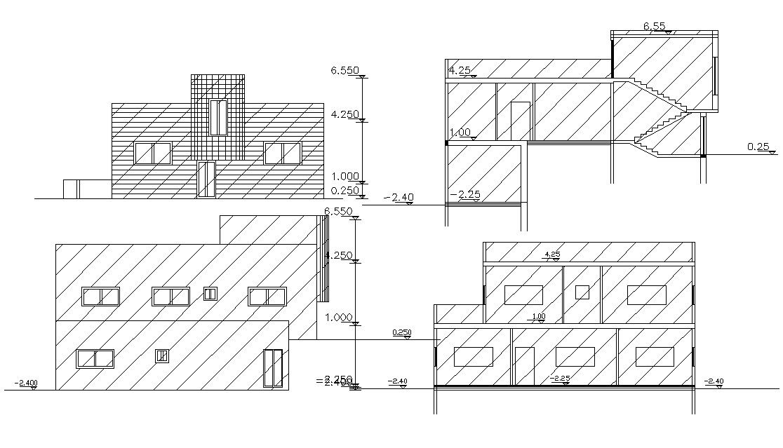 3 BHK residence house building front and side view section drawing and elevation design with all dimension detail and floor level building design. download 36 feet width and 44depth of house building design DWG file.