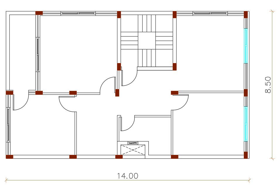 27 by 55 feet house ground floor plan design with column layout detail and wall-size detail. download free AutoCAD house plan design DWG file.