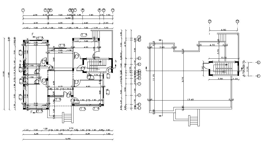 Download residential bungalow layout ground floor and terrace plan that shows bungalow size detail of 50' X 40' Feet that is about (665 square yards). Here the bungalow working dimension details, section line, floor level, staircase, column layout, door window tags, and many other details are shown.