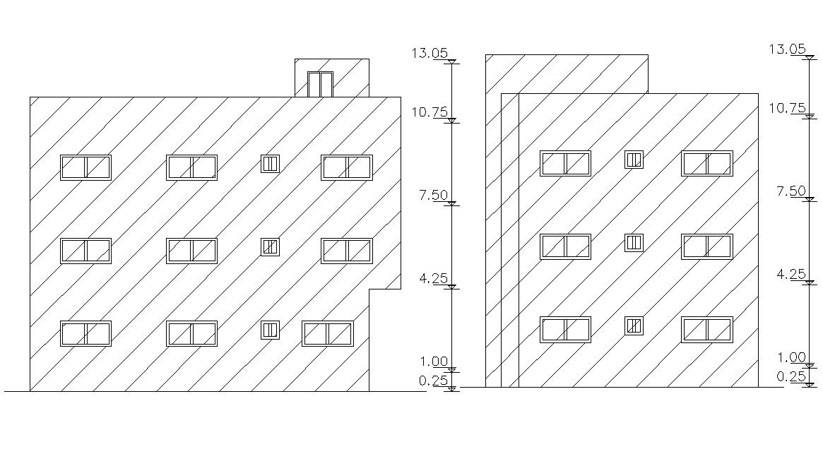 Residential apartment right side and left side elevation design that shows contemporary apartment elevations view along with apartmnet floor leveling details download CAD drawing for free.