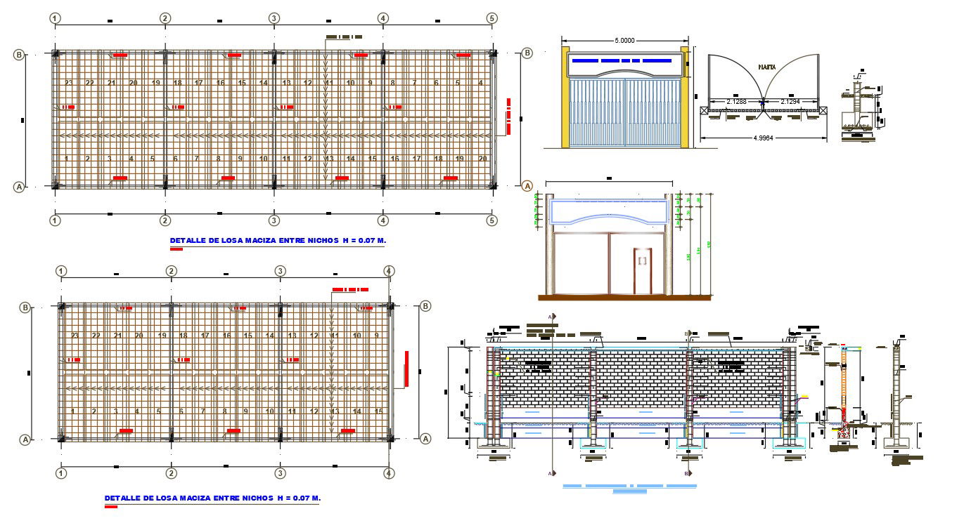 AutoCAD drawing of warehouse project detail includes column footing concrete, burnt brick wall design, entrance main door elevation design and measurement dimension detail.
